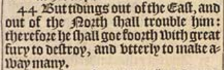 44 But tidings out of the East, and out of the North shall trouble him: therefore he shall goe foorth with great fury to destroy, and vtterly to make away many.
