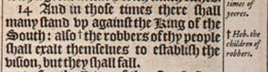 14 And in those times there shall many stand vp against the King of the South: also +the robbers of thy people shall exalt themselues to establish the vision, but they shall fall. [ +Heb. the children of robbers. ]
