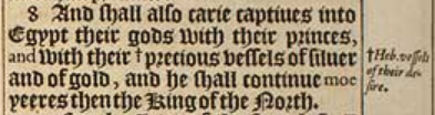 8 And shall also carie captiues into Egypt their gods with their princes, and with their +precious vessels of siluer and of gold, and he shall continue moe yeeres then the King of the North. [ Heb. vessels of their desire. ]