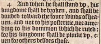 4 Und wenn er aufsteht, wir sein Königreich gebrochen werden und wird in Richtung der vier Winde des Himmels geteilt werden; und nicht zu seinem Gedeihen, noch gemäß seiner Herrschaft, die er ausübt: Denn sein Königreich wird ausgerissen werden, wegen anderer neben diesen.