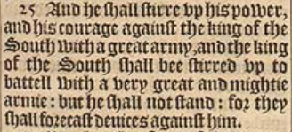 25 And he shall stirre vp his power, and his courage against the king of the South with a great army, and the king of the South shall bee stirred vp to battell with a very great and mightie armie: but he shall not stand: for they shall forecast deuices against him.