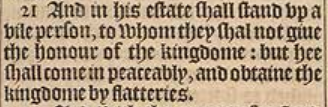 21 And in his estate shall stand vp a vile person, to whom they shal not giue the honour of the kingdome: but hee shall come in peaceably, and obtaine the kingdome by flatteries.