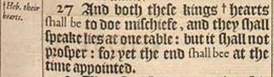 27 And both these kings +hearts shall be to doe mischiefe, and they shall speake lies at one table: but it shall not prosper: for yet the end shall bee at the time appointed. [ +Heb. their hearts. ]