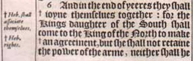 6 And in the end of yeeres they shall +ioyne themselues together: for the Kings daughter of the South shall come to the King of the North to make +an agreement, but she shall not retaine the power of the arme, neither shall he stand, nor his arme: but she shall be giuen vp, and they that brought her, and ||he that begate her, and he that strengthened her in these times. [ +Heb. shall associate themselues. , +Heb. rights. , || Or, whom she brought forth. ]