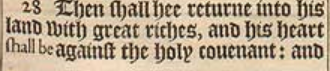 28 Then shall hee returne into his land with great riches, and his heart shall be against the holy couenant: and he shall doe exploits, and returne to his owne land.