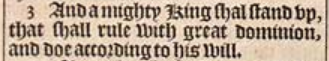 3 And a mighty King shal stand vp, that shall rule with great dominion, and doe according to his will.