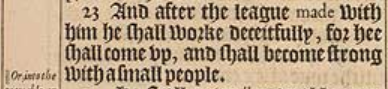 23 And after the league made with him he shall worke deceitfully, for hee shall come vp, and shall become strong with a small people.