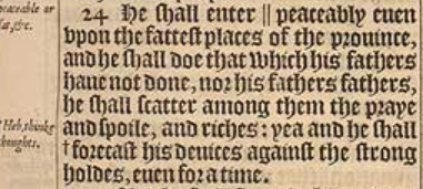 24 He shall enter || peaceably euen vpon the fattest places of the prouince, and he shall doe that which his fathers haue not done, nor his fathers fathers, he shall scatter among them the praye and spoile, and riches: yea and he shall +forecast his deuices against the strong holdes, euen for a time. [ || Or, into the peaceable or for, &c. , +Heb. thinke thoughts.]