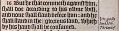 16 But he that commeth against him, shall doe according to his owne will, and none shall stand before him: and he shall stand in the || glorious land, which by his hand shall be consumed. [ || Or, goodly land. Heb. The land of ornament. ]