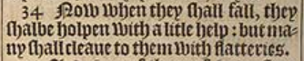 34 Now when they shall fall, they shalbe holpen with a litle help: but many shall cleaue to them with flatteries.