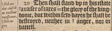20 Then shall stand vp in his estate +a raiser of taxes in the glory of the kingdome, but within few dayes he shall be destroyed, neither in +anger, nor in battell. [ +Heb. one that causeth an exactour to passe ouer. , +Heb. angers.]