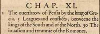 1 The ouerthrow of Persia by the king of Grecia. 5 Leagues and conflicts, betweene the kings of the South and of the North. 30 The inuasion and tyrannie of the Romanes.