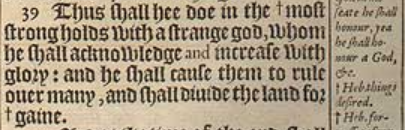 39 Thus shall hee doe in the +most strong holds with a strange god, whom he shall acknowledge and increase with glory: and he shall cause them to rule ouer many, and shall diuide the land for +gaine. [+Heb. fortresses of munitions. , +Heb. a price ]