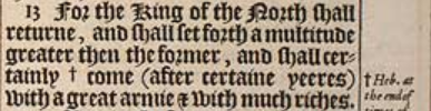 13 For the King of the North shall returne, and shall set forth a multitude greater then the former, and shall certainly +come (after certaine yeeres) with a great armie & with much riches. [ +Heb. at the end of times of yeeres. ]