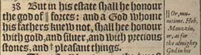 38 But in his estate shall he honour the god of || forces: and a God whome his fathers knew not, shall hee honour with gold, and siluer, and with precious stones, and+ pleasant things. [|| Or, munitions. Heb. Mauzzin, or, as for the almighty God in his seate he shall honour, yea he shall honour a God, &c. , +Heb. things desired. ]