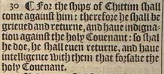 30 ¶ For the ships of Chittim shall come against him: therefore he shall be grieued and returne, and haue indignation against the holy Couenant: so shal he doe, he shall euen returne, and haue intelligence with them that forsake the holy Couenant.