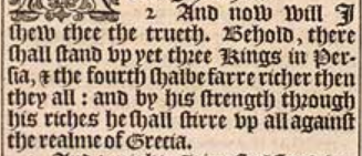 2 And now will I shew thee the trueth. Behold, there shall stand vp yet three Kings in Persia, & the fourth shalbe farre richer then they all: and by his strength through his riches he shall stirre vp all against the realme of Grecia.
