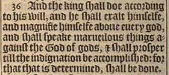 36 And the king shall doe according to his will, and he shall exalt himselfe, and magnifie himselfe aboue euery god, and shall speake marueilous things against the God of gods, & shall prosper till the indignation be accomplished: for that that is determined, shall be done.