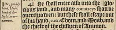 41 He shall enter also into the || glorious land, and many countreys shall be ouerthrowen: but these shall escape out of his hand, euen Edom, and Moab, and the chiefe of the children of Ammon. [ || Or, goodly land. Hebr. land of delight, or ornament. ]