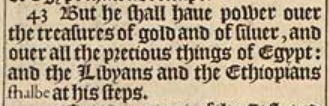 43 But he shall haue power ouer the treasures of gold and of siluer, and ouer all the precious things of Egypt: and the Libyans and the Ethiopians shalbe at his steps.
