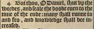 4 But thou, O Daniel, shut vp the wordes, and seale the booke euen to the time of the ende: many shall runne to and fro, and knowledge shall bee increased.