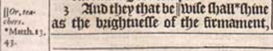 3 And they that be || wise shall *shine as the brightnesse of the firmament, and they that turne many to righteousnesse, as the starres for euer and euer. [ || Or, teachers. , *Matth.13. 43.]
