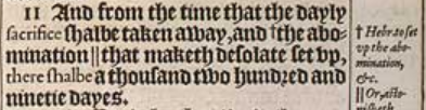 11And from the time that the dayly sacrifice shalbe taken away, and +the abomination || that maketh desolate set vp, there shalbe a thousand two hundred and ninetie dayes. [+Hebr. to set vp the abomination, &c. , || Or, astonisheth.]