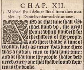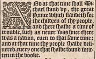 1 And at that time shall Michael stand vp, the great Prince which standeth for the children of thy people, and there shalbe a time of trouble, such as neuer was since there was a nation, euen to that same time: and at that time thy people shalbe deliuered, euery one that shalbe found written in the booke.