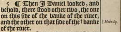 5 ¶ Then I Daniel looked, and behold, there stood other two, the one on this side of the banke of the riuer, and the other on that side of the +banke of the riuer. [+Hebr. lip.]