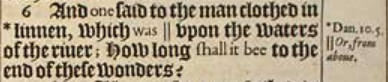 6 And one said to the man clothed in *linnen, which was || vpon the waters of the riuer; How long shall it bee to the end of these wonders? [ *Dan.10.5. , || Or, from aboue.]
