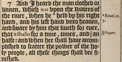 7 Und ich hörte den Mann, gekleidet in Leinen, der über den Wassern des Flusses war, als er *seine rechte Hand und seine linke Hand hoch hielt zum Himmel und schwor bei ihm, der für immer lebt, dass es für eine Zeit, Zeiten und ||eine Halbe (anm.d.Ü.: 3,5 Jahre) sein wird: Und als er es vollbracht hatte, die Macht der heiligen Leute zu zerstreuen, werden all diese Dinge vollendet sein.[*Offenb. 10:5 ||oder: Teil]