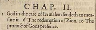 1 Gott schickt, in Fürsorge für Jerusalem, es zu vermessen. 6 Die Erlösung Zions. 10 Das Versprechen von Gottes Gegenwart.