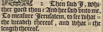 2 Then said I, Whither goest thou? And hee said vnto me, To measure Ierusalem, to see what is the breadth thereof, and what is the length thereof.