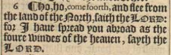 6 ¶ Ho, ho, come foorth, and flee from the land of the North, saith the LORD: for I haue spread you abroad as the foure windes of the heauen, sayth the LORD.