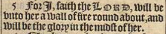 5 For I, saith the LORD, will be vnto her a wall of fire round about, and will be the glory in the midst of her.