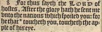 8 For thus sayth the LORD of hostes, After the glory hath he sent me vnto the nations which spoiled you: for he that *toucheth you, toucheth the apple of his eye. [ *Deu.32. 10. psal. 17.8. ]