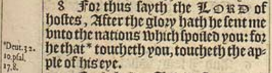 8 For thus sayth the LORD of hostes, After the glory hath he sent me vnto the nations which spoiled you: for he that *toucheth you, toucheth the apple of his eye. [ *Deu.32. 10. psal. 17.8. ]