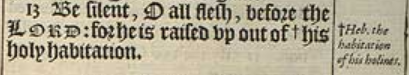 13 Be silent, O all flesh, before the LORD: for he is raised vp out of +his holy habitation. [ +Heb. the habitation of his holines. ]