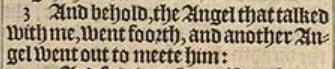 3 And behold, the Angel that talked with me, went foorth, and another Angel went out to meete him: