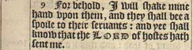 9 For behold, I will shake mine hand vpon them, and they shall bee a spoile to their seruants: and yee shall know that the LORD of hostes hath sent me.