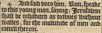 4 And said vnto him, Run, speake to this young man, saying; Ierusalem shall be inhabited as townes without walles, for the multitude of men and cattell therein.