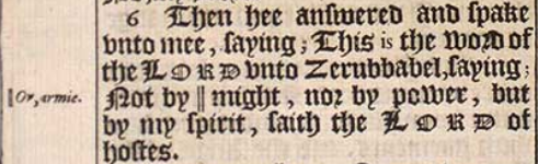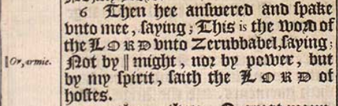 6 Then hee answered and spake vnto mee, saying; This is the word of the LORD vnto Zerubbabel, saying; Not by || might, nor by power, but by my spirit, saith the LORD of hostes. [ || Or, armie. ]