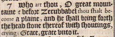 7 Who art thou, O great mountaine? before Zerubbabel thou shalt become a plaine, and he shall bring forth the head stone thereof with shoutings, crying; Grace, grace vnto it.