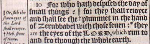 10 For who hath despised the day of small things? || for they shall reioyce and shall see the +plummet in the hand of Zerubbabel with those seuen: *they are the eyes of the LORD, which run to and fro through the whole earth. [ || Or, sith the seuen eyes of the Lord shall reioyce. , +Heb. stone of tinne. , * Chap.3.9. ]