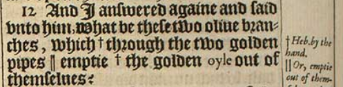 12 And I answered againe and said vnto him, What be these two oliue branches, which+through the two golden pipes || emptie+the golden oyle out of themselues? [ +Heb. by the hand. , || Or, emptie out of themselues oyle into the gold. , +Heb. the gold, ]