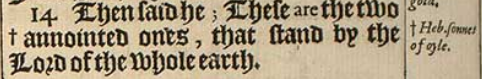 14 Then said he; These are the two +annointed ones, that stand by the Lord of the whole earth. [ +Heb. sonnes of oyle. ]