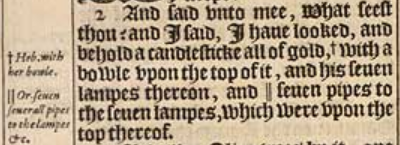 2 And said vnto mee, What seest thou? and I said, I haue looked, and behold a candlesticke all of gold, +with a bowle vpon the top of it, and his seuen lampes thereon, and || seuen pipes to the seuen lampes, which were vpon the top thereof. [ +Heb. with her bowle. , || Or, seuen seuerall pipes to the lampes &c. ]