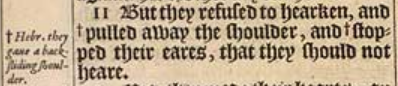 11 But they refused to hearken, and +pulled away the shoulder, and +stopped their eares, that they should not heare. [ +Hebr. they gaue a backsliding shoulder. , +Hebr. made heauie. ]