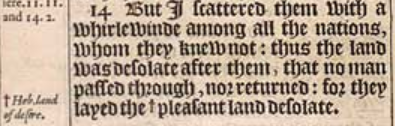 14 But I scattered them with a whirlewinde among all the nations, whom they knew not: thus the land was desolate after them, that no man passed through, nor returned: for they layed the +pleasant land desolate. [ +Heb. land of desire. ]
