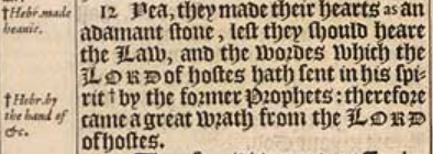 12 Yea, they made their hearts as an adamant stone, lest they should heare the Law, and the wordes which the LORD of hostes hath sent in his spirit +by the former Prophets: therefore came a great wrath from the Lord of hostes. [ +Hebr. by the hand of &c. ]